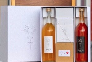 青森県平川市産のミニトマトとリンゴジュース、津軽びいどろをセットにした贅沢ギフト。自分へのご褒美にも最適です。